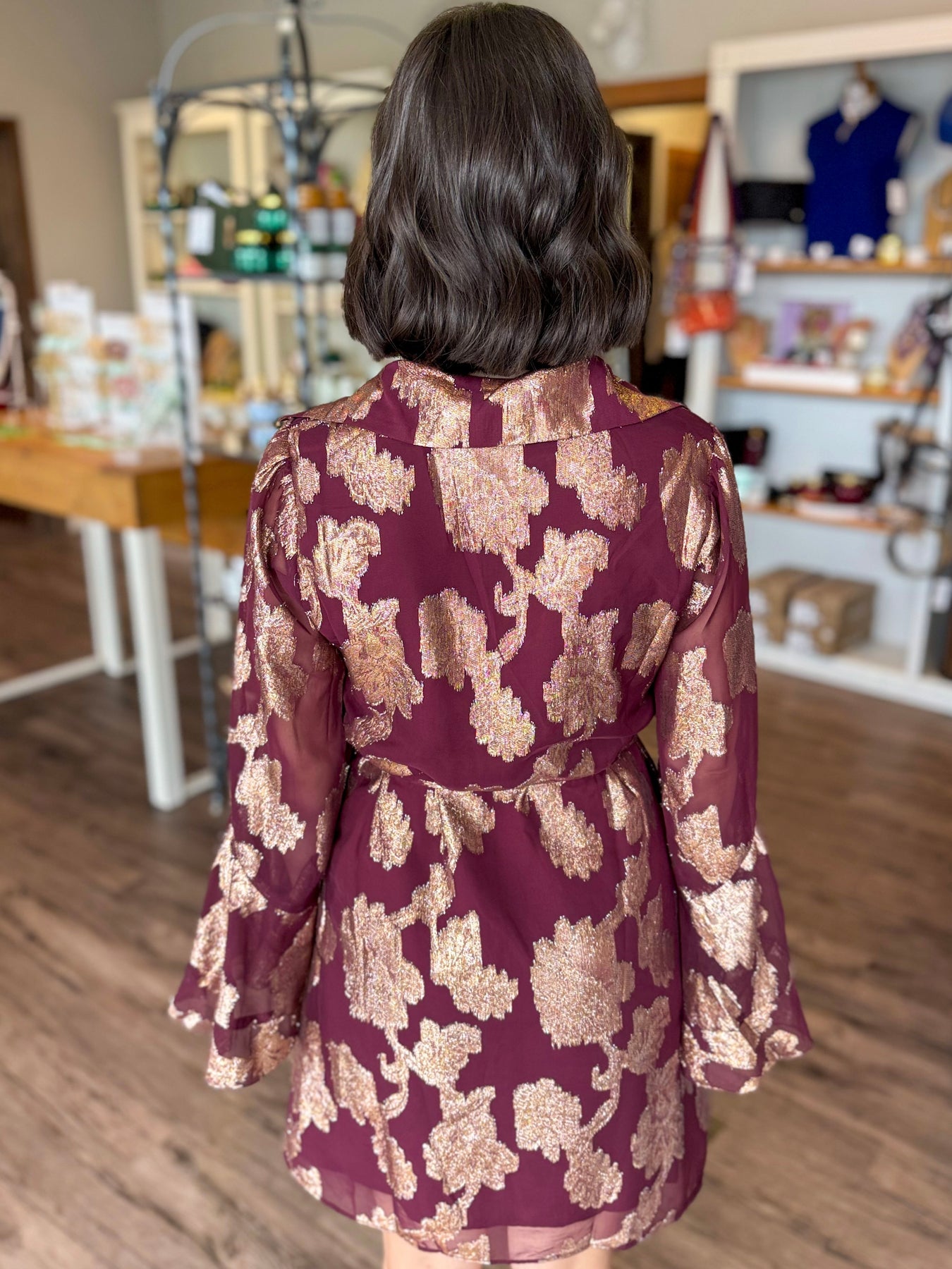 Gold and burgundy bell sleeve mini dress with tie by Ciebon
