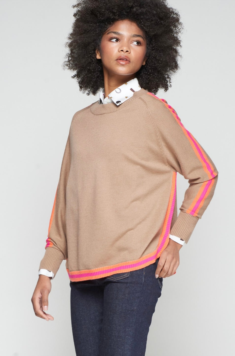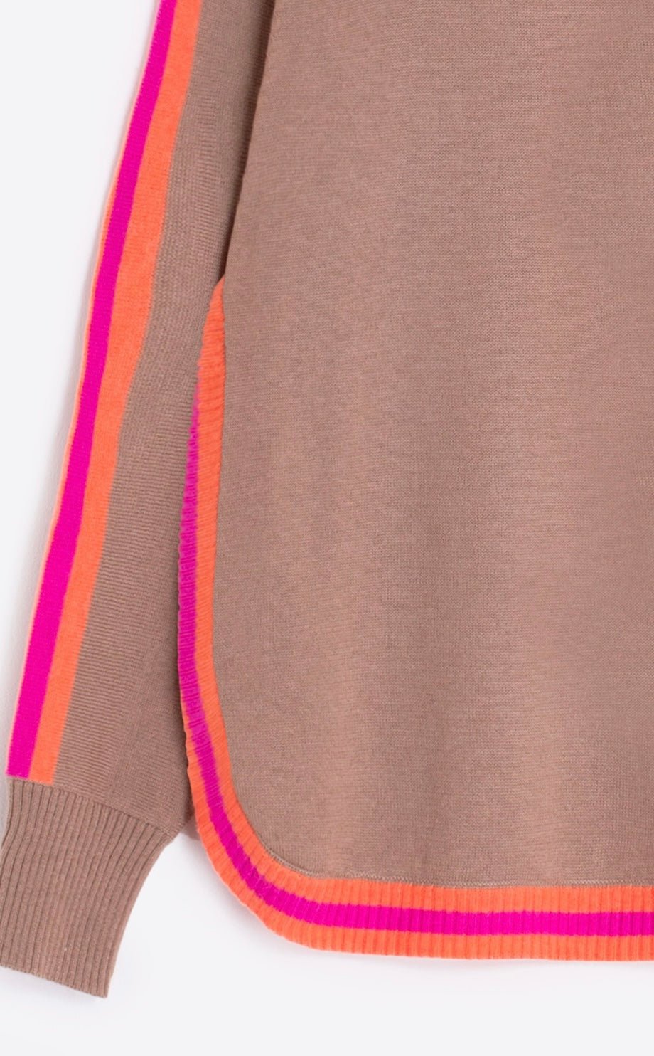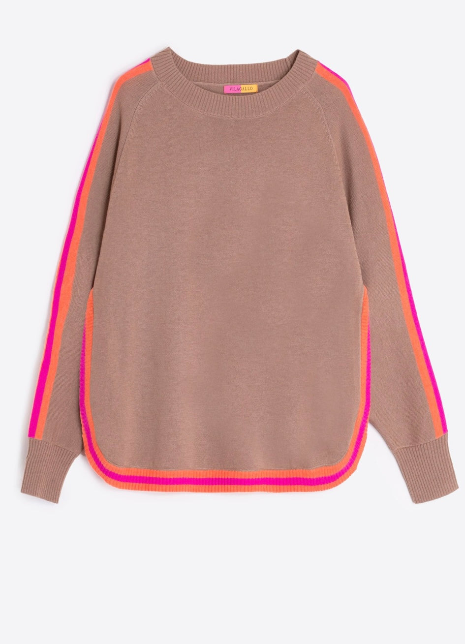 Beige sweater with orange and pink stripe trim by Vilagallo