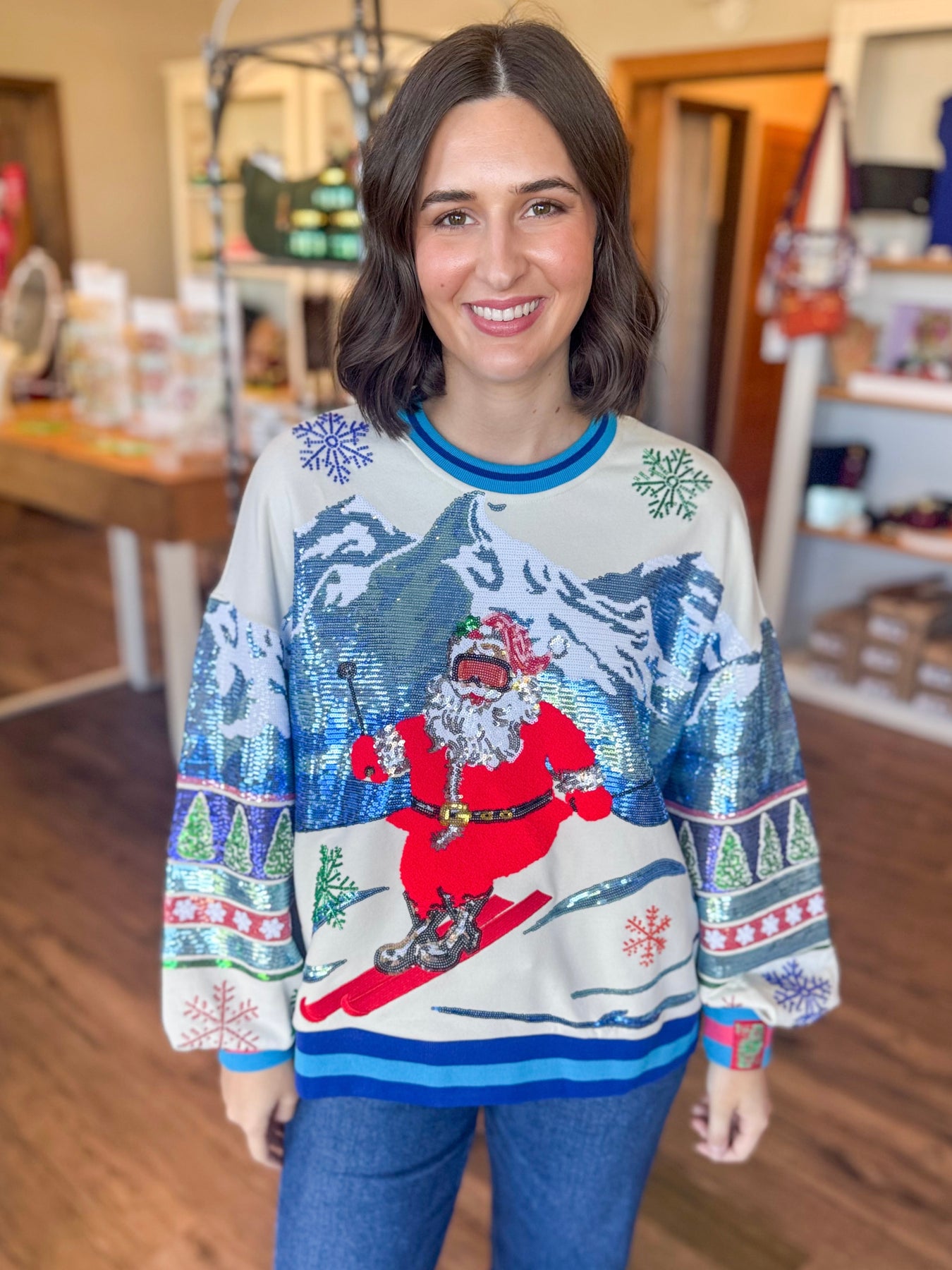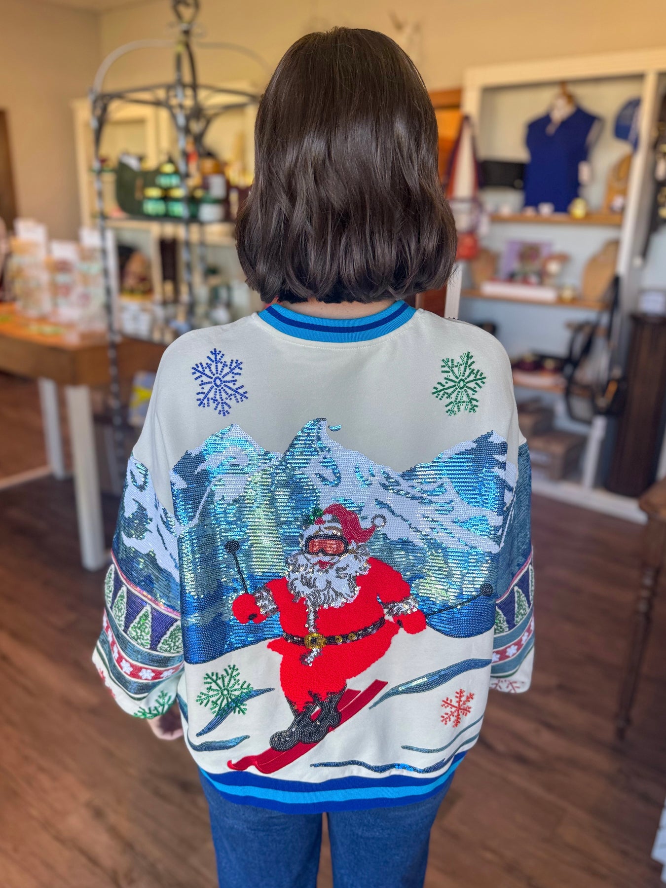 Vintage skiing Santa sequin sweatshirt by Queen of Sparkles